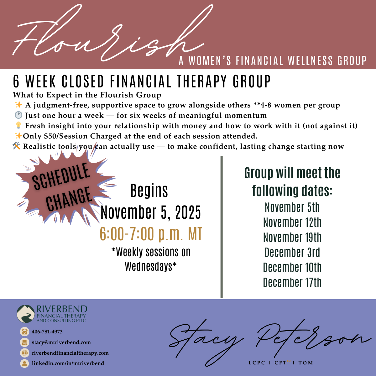 The next round of Flourish: Women’s Financial Wellness Group on Tuesday, November 5th instead of this week.